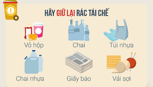 - Rác tái chế: Nhựa sạch, giấy, bìa carton, lon nhôm, chai lọ thủy tinh, kim loại không gỉ.