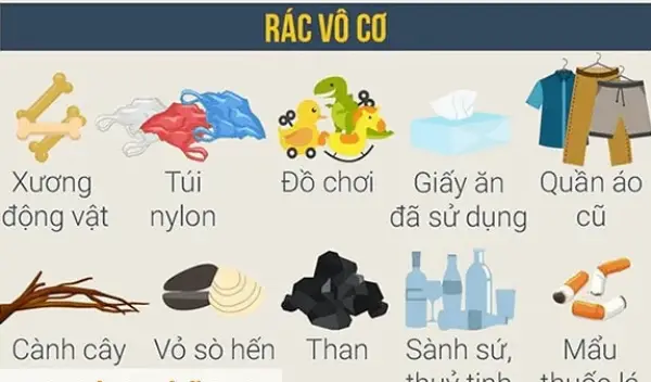 - Rác vô cơ: Gồm túi nilon, xốp, thủy tinh, sành sứ, gạch vỡ, cao su, kim loại vụn.